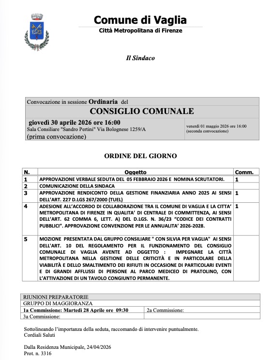 Convocazione del Consiglio Comunale in seduta ordinaria giovedì 30 Aprile ore 16:00 presso la sala consiliare Sandro Pertini via Bolognese 1259/A